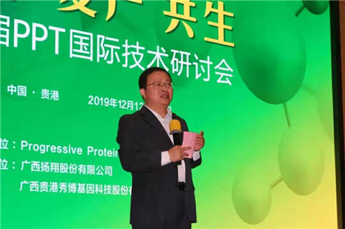 (上为ppt公司ceo、阿尔伯塔大学教授王志全致开幕词,下为扬翔股份副总裁高远飞主持大会)
